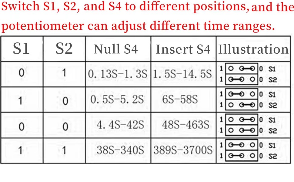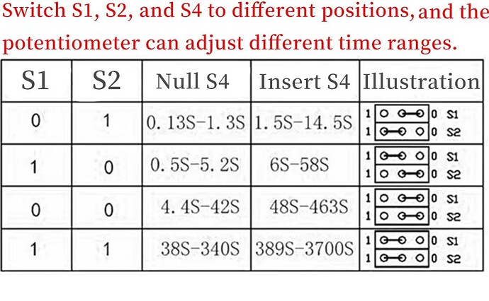 Refer to this table for how to adjust the course time delay. If you are looking at the board above, the jumper pins are “1” if they connect the left and center pins, and “0” if they connect the center and right pins. For S4 (The lower course time adjust), instead of moving the jumper left and right, you pull it out (Null) and put it in (Insert).