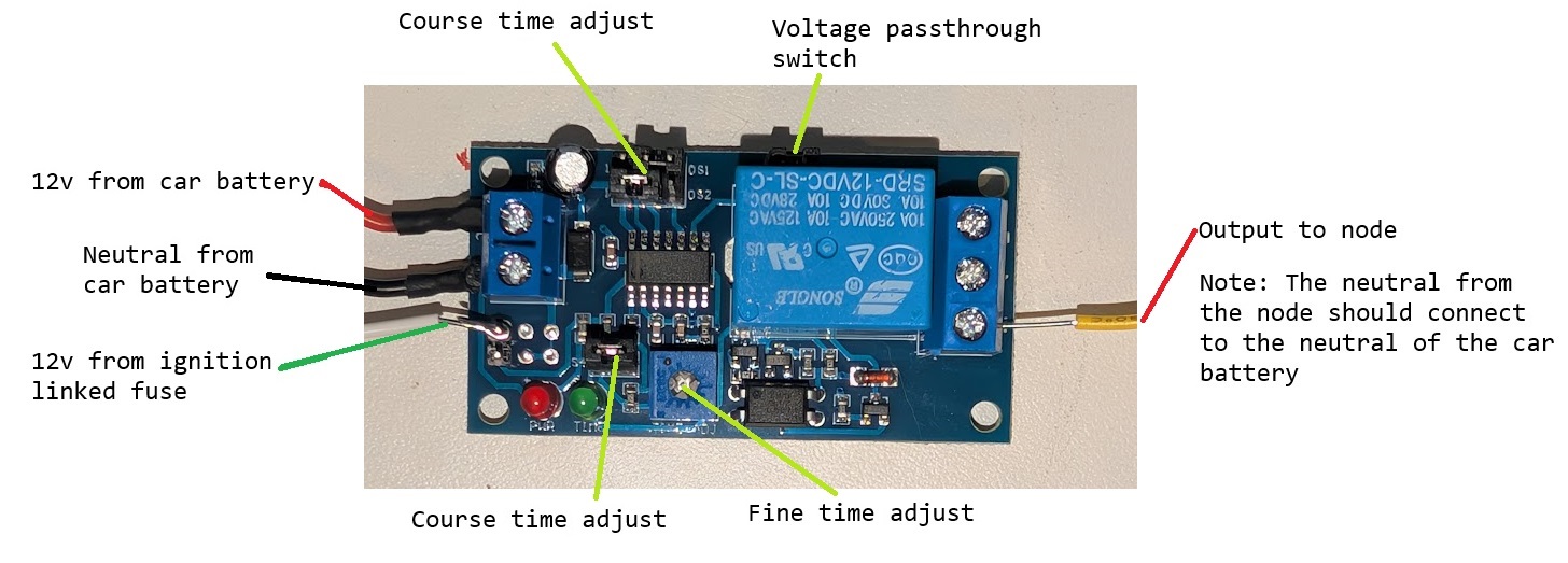 If you want to power your car node from the car’s battery but don’t want it to stay on at all times, you could install a delayed shutoff circuit. With one of these boards you can configure your node to turn off between 0.1 seconds and 1 hour after you turn your car off.[1]