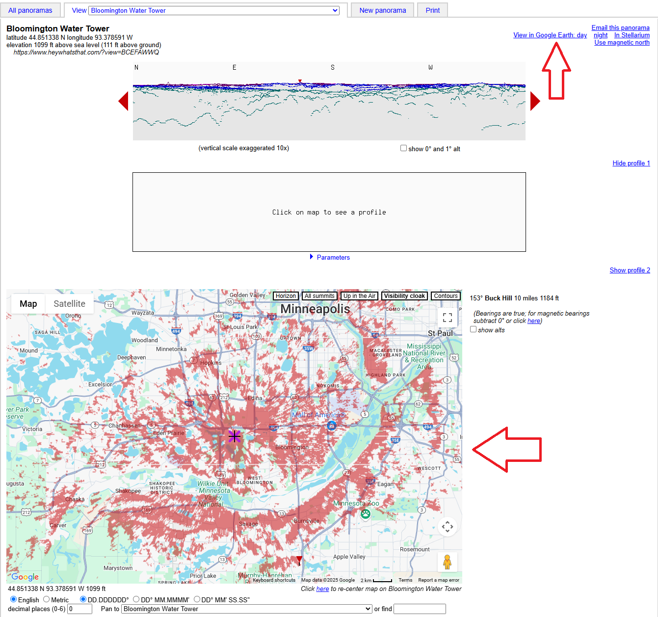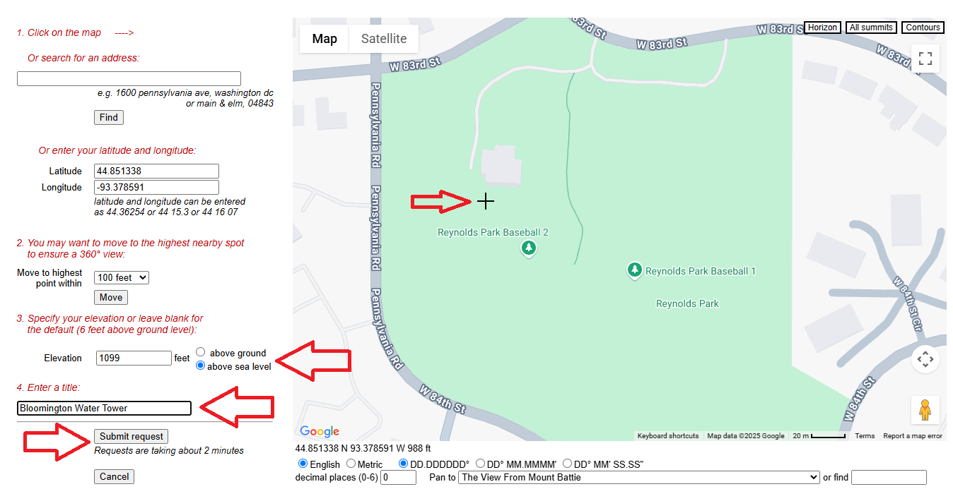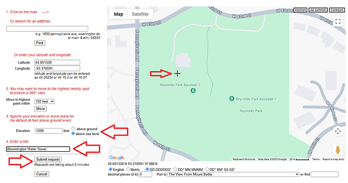 Next enter the height of the water tower, which we found to be 335m or 1099 feet. Make sure to select “above sea level” if you are using the height from Google Earth.