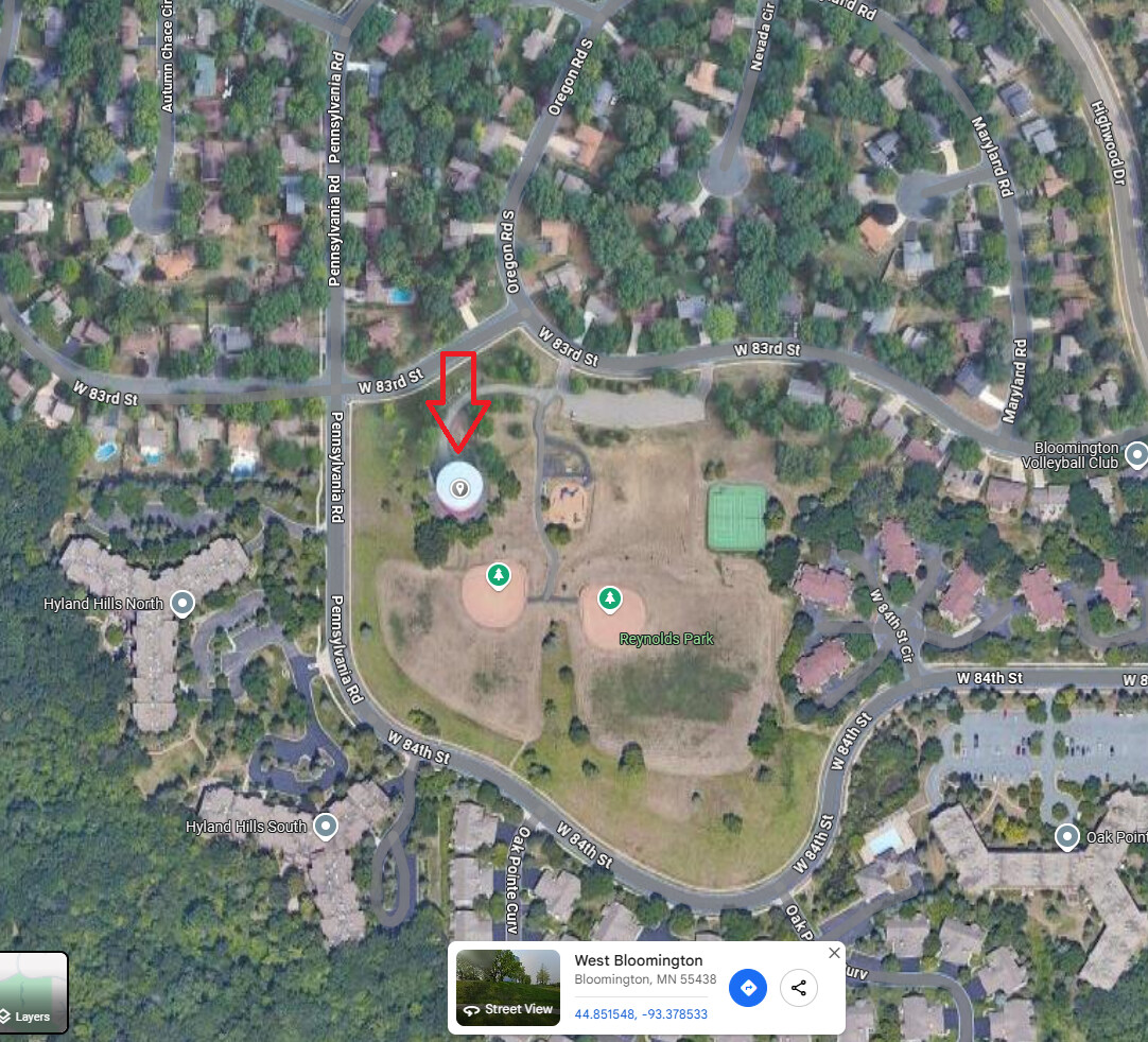 In this example we will create a coverage map for the top of a water tower in Bloomington, Minnesota. Here is the location on google maps:
