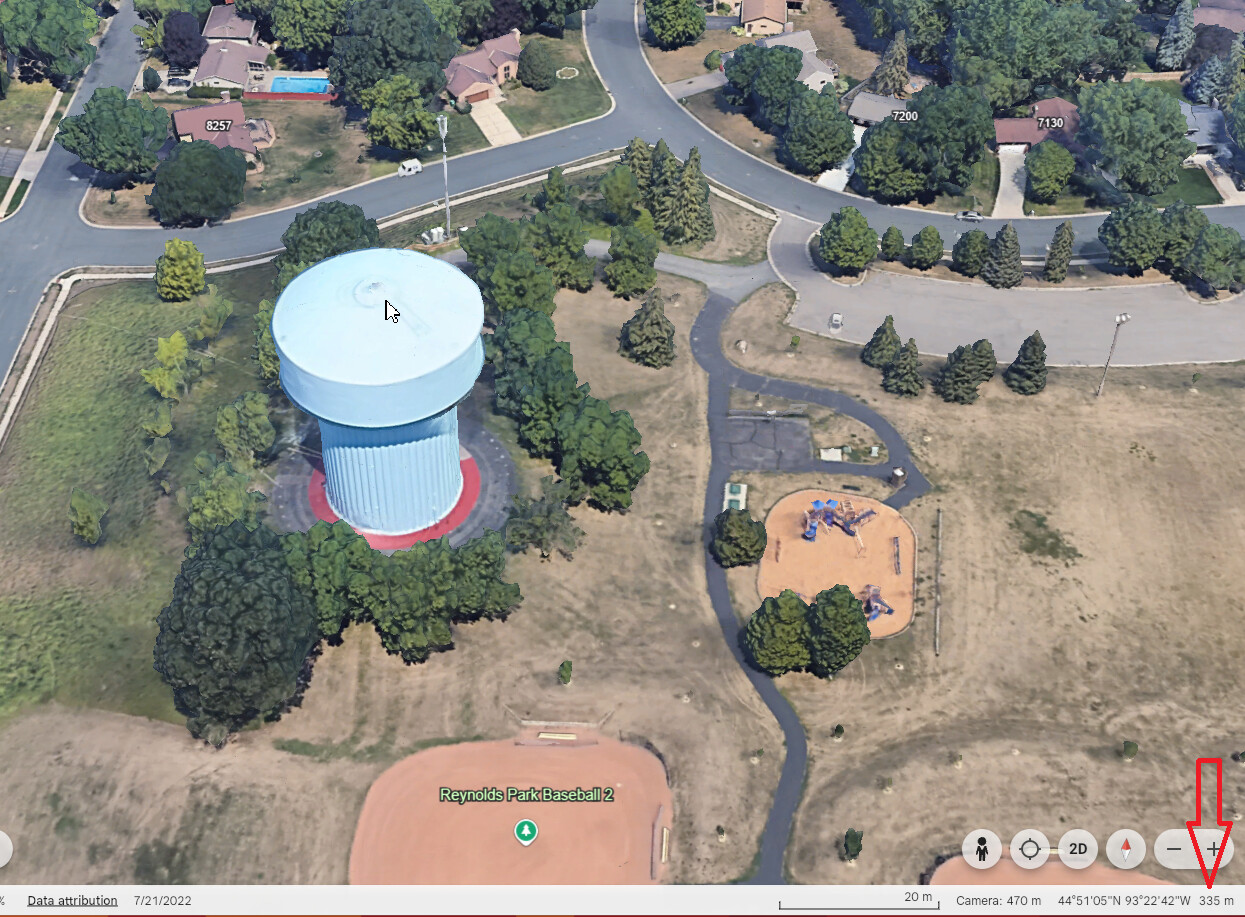 To get the height of the water tower, we can use Google Earth. If you hover over the water tower, you can see the height of the water tower in the bottom right corner. This height is in meters and from Mean Sea Level (MSL). In this example, it shows as “335m”. HWT lets us input the height as either height above ground or height above sea level, so we can use this value directly. It will need to be converted to feet, in this case it is 1099 feet.